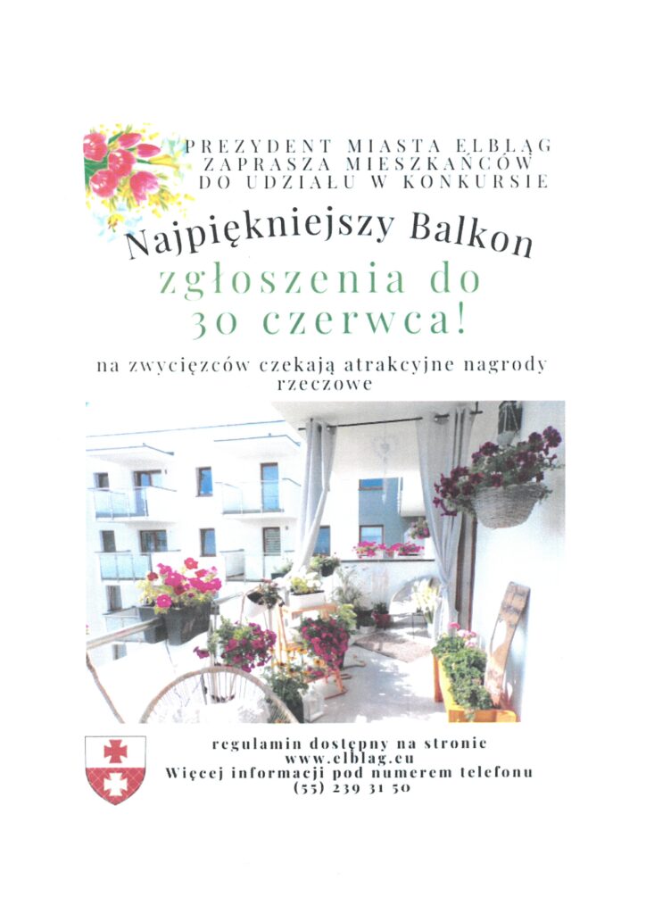 Prezydent Miasta Elbląg wraz z Departamentem Ochrony Środowiska zaprasza wszystkich mieszkańców Gminy Miasta Elbląg do udziału w konkursie : „NAJPIĘKNIEJSZY BALKON”.