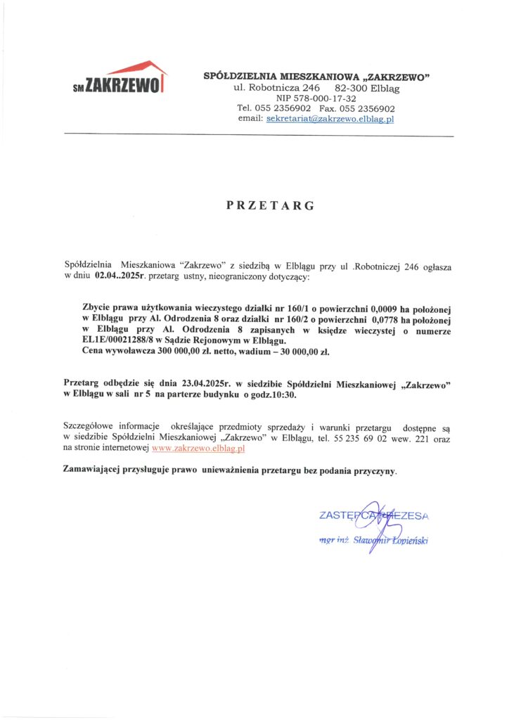 Administratorem danych osobowych jest Spółdzielnia Mieszkaniowa „Zakrzewo” w Elblągu, z siedzibą przy ulicy Robotniczej 246, 82-300 Elbląg, tel. 55 235 69 02 – reprezentowaną przez Zarząd Spółdzielni.