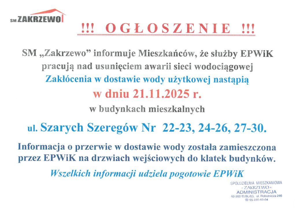 Administratorem danych osobowych jest Spółdzielnia Mieszkaniowa „Zakrzewo” w Elblągu, z  siedzibą przy ulicy Robotniczej 246, 82-300 Elbląg, tel. 55 235 69 02 – reprezentowaną przez Zarząd Spółdzielni.