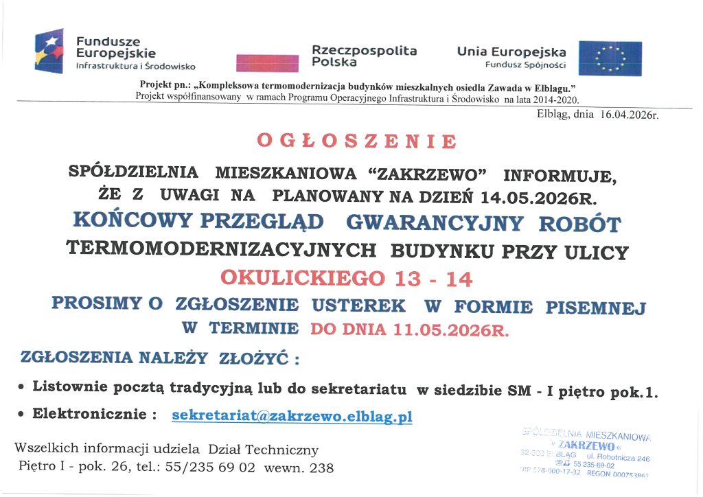 Administratorem danych osobowych jest Spółdzielnia Mieszkaniowa „Zakrzewo” w Elblągu, z  siedzibą przy ulicy Robotniczej 246, 82-300 Elbląg, tel. 55 235 69 02 – reprezentowaną przez Zarząd Spółdzielni.